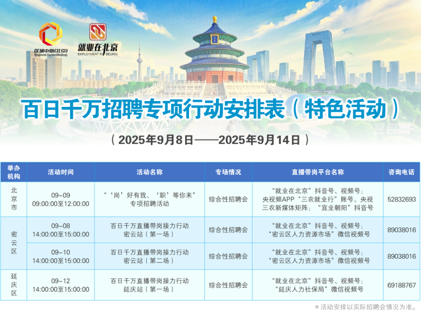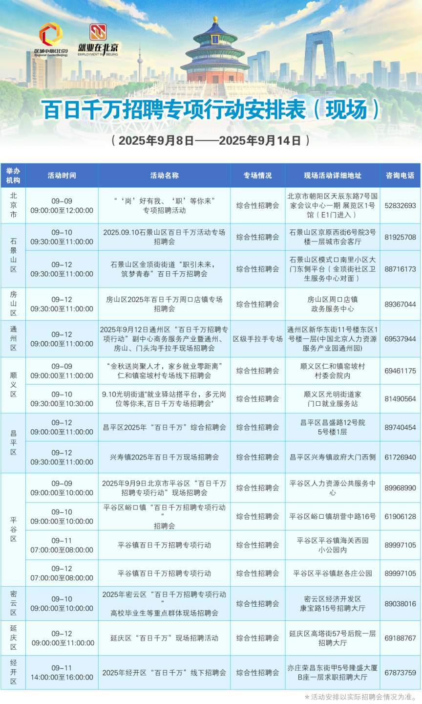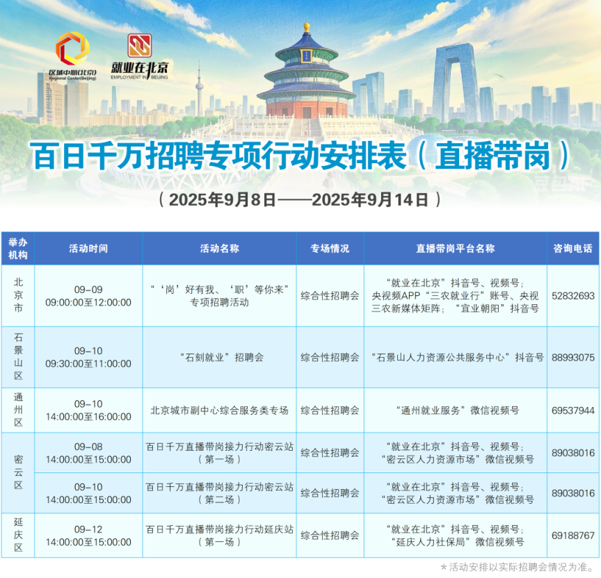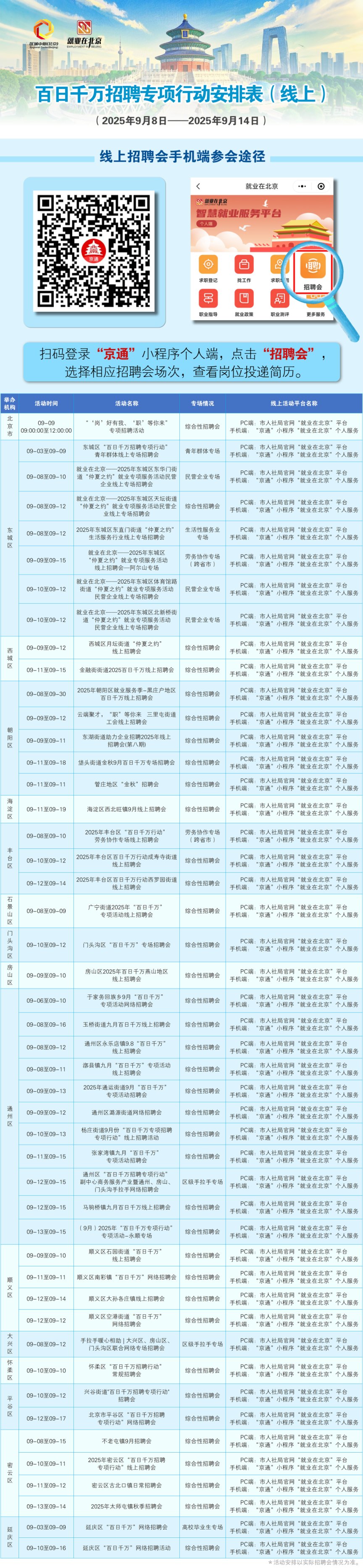 本次招聘共涉及燕山教育委员会所属7个事业单位,13个岗位,拟招聘13人。报考人员须于2025年9月8日10:00至9月15日11:00期间登录北京市人力资源和社会保障局网站,在网站顶部点击进入“个人办事”--选择北京市事业单位公开招聘服务平台--“个人登录”提交应聘申请。